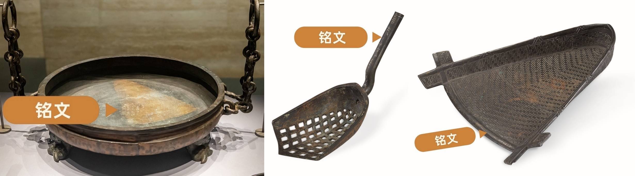 在炭炉炉底、铜箕口沿和铜漏铲手柄正面