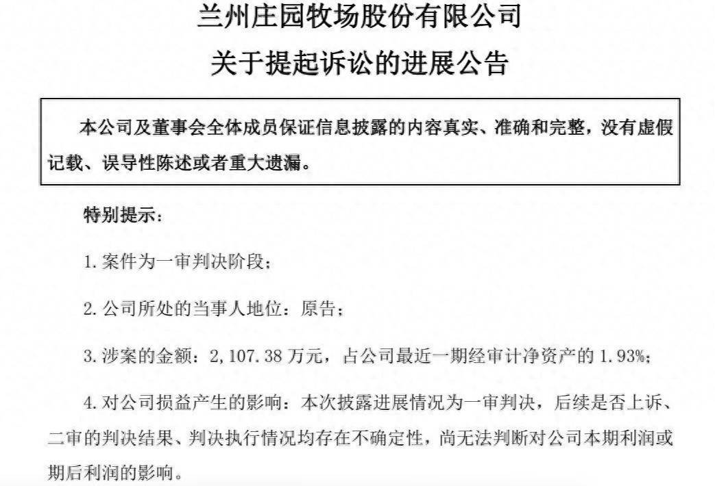庄园牧场暗示,本次浮现剖析情况为一审判决,后续是否上诉、二审的判决效果、判决施行情况均存在不治服性,尚无法判断对公司本期利润或期后利润的影响。
