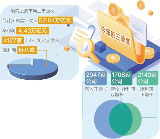 笔据中国上市公司协会发布的数据瓦解,本年前三季度,上市公司举座事迹旯旮向好,行业复苏趋势彰着,境内股票阛阓上市公司测度完了贸易收入52.64万亿元、净利润4.43万亿元。2947家公司营收正增长,2149家公司净利润正增长,1708家公司营收、净利润双增长。4127家上市公司完了盈利,盈利面近约略。