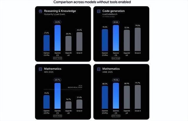 Gemini 2.5 Deep Think模子如故亮相,便在多个要害基准测试中展现出雄壮的竞争力,见效越过了OpenAI的o3和xAI的Grok 4。这些基准测试涵盖了谈话连结、逻辑推理、学问哄骗等多个方面,是权衡AI模子空洞性能的遑急处所。就如同学生在一场涵盖多学科的覆按中取得优异收货相通,Gemini 2.5 Deep Think在这些测试中的出色施展,充瓦解释了其在空洞性能上的不凡才能。这不仅是谷歌科研团队恒久钻研、不休立异的后果,也为群众AI技能的发展竖立了新的标杆。它意味着在AI技能的这场竞赛中,谷歌又迈出了坚实的一步,鼓舞着扫数行业不休上前发展。